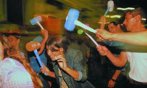 This is the Sao Joao Festival in Porto, Portugal–a celebration in honour of St. John, the patron saint of lovers. Apparently, hitting a member of the opposite sex on the head is meant to be a turn-on. In the old days, the head-basher of choice was a leek. Don’t ask me why. If someone said they were going to take a “leek” on my head, I’d run the other way screaming. No one knows why the leek was dropped in favour of squeaky hammers–likely due to an influx of head injuries. Plus, a night of having giant onions whipped across your head would make your hair smell appalling. No amount of “Gee Your Hair Smells Terrific” (remember that shampoo?) would set it right.