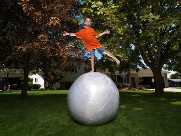According to the Guinness World Records people, this is the world’s largest ball made of cling wrap. There have been others? And this sucker weighs over 281 pounds. The last time I looked, Saran Wrap wasn’t cheap, making this one valuable ball. Not that anyone would want to use any of this cellophane now. He’s put his feet on it. And I think I see dog droppings in the lawn.
