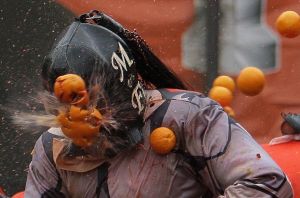 In the Northern Italian city of Ivrea, citizens and tourists alike come out to mark this festival with a very strange origin. Apparently in the 12th or 13th century (the story varies from one source to another), a tyrant from a powerful family attempted to rape a young commoner on her wedding night. He was unsuccessful as she decapitated him. Not with an orange, by the way.