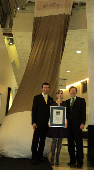 It turns out that a group in Rhode Island, Project Undercover, holds the Guinness World Record for the World’s Largest Sock and–you guessed it–it looms a whopping 32 feet in height. Holy crap. And they patterned it with a standard sock monkey puppet in mind. Here’s the finished product…